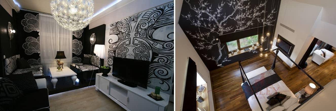- Интересным решение будет использование популярных сегодня виниловых наклеек, которые можно клеить непосредственно на обои.