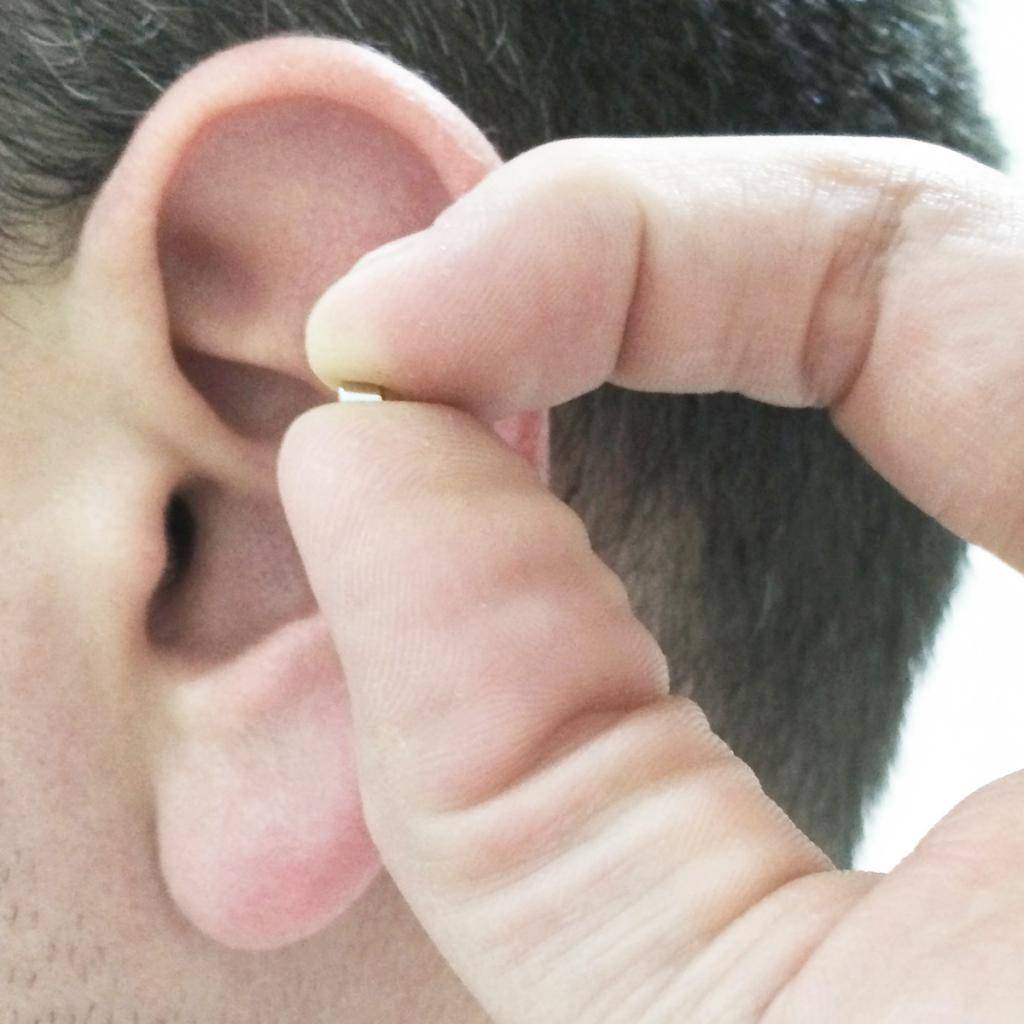 - Введите трубку как можно дальше в ухо. Разожмите ее, чтобы отпустить микронаушник. Он должен лечь аккурат на барабанную перепонку. Признак этого – вы почувствуете некоторую заложенность в ухе.