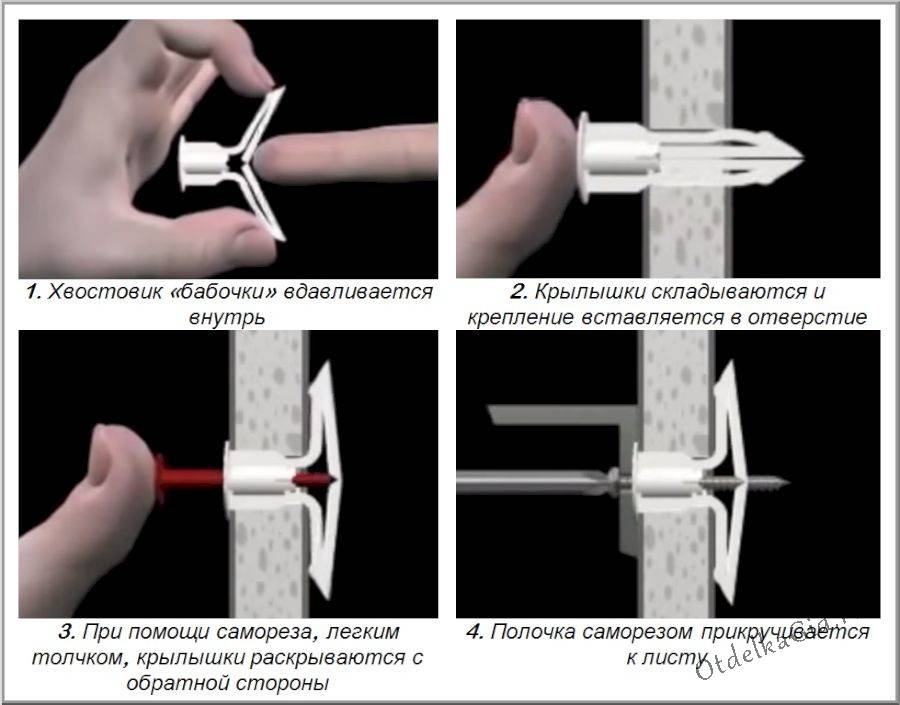 Еще одна технология, позволяющая выполнить монтаж шкафчиков на стену из ГКЛ своими руками, предусматривает использование специальных дюбелей для гипсокартона:
