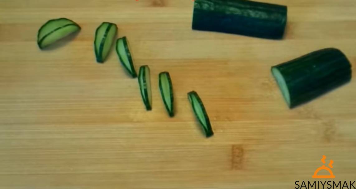 Для рецепта подготовьте продукты. Нужны тонкие ломтики ингредиентов. Нарежьте огурец, сыр, семгу. Перец достаточно очистить и разрезать пополам.