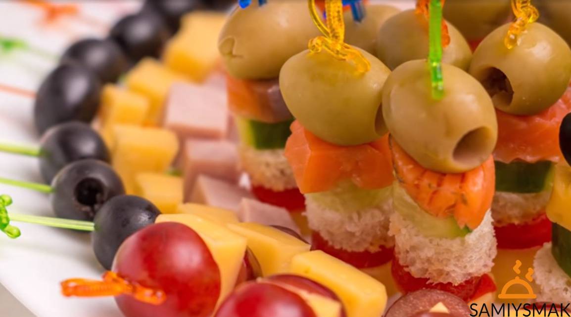 Итак, как сделать вы уже знаете. Для канапе используйте перец, огурец, сыр. Но сначала на шпажку накалывайте оливку с семгой.