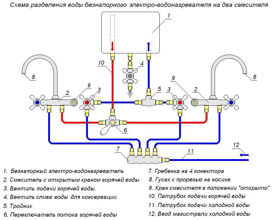 - как накопительный, так и проточный водонагреватель должен одновременно подавать воду на душ и на кран;