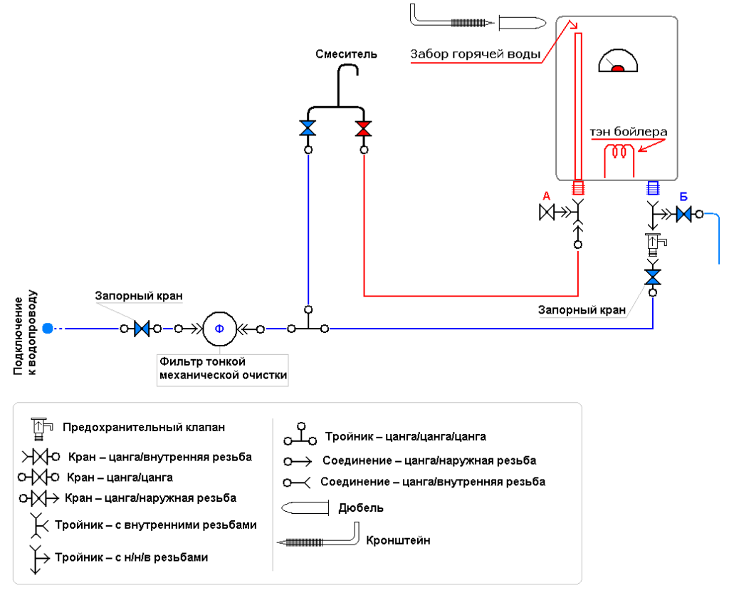 Схема подключения водонагревателя к системе водоснабжения выглядит следующим образом: