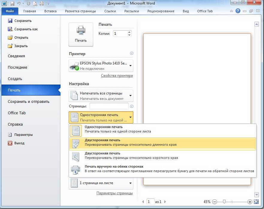 Не каждый принтер поддерживает функцию автоматической печати с двух сторон, но в некоторых моделях эта услуга доступна. Если ваше устройство обладает такой возможностью, то просто устанавливаете перед печатью галочку напротив опции Двусторонняя печать.