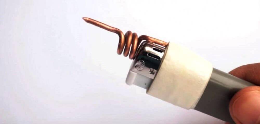 Третий способ — сделать газовый паяльник из зажигалки своими руками. Нужно взять кусок медного одножильного провода и прикрепить к зажигалке так, чтобы часть провода была в пламени. По медному проводу передается тепло на некоторое расстояние, как видно из фото.