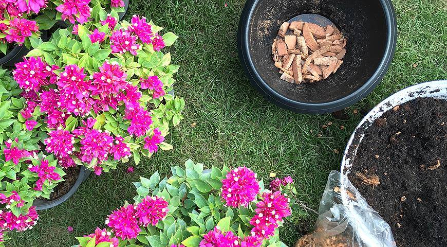 К емкостям особенных требований бугенвиллеи не предъявляют, за исключением размера «по корневищу», несильного увеличения диаметра (на 2-3 см), достаточной глубины и наличия хороших дренажных отверстий. На дно обязательно закладывают крупнофрагментарный дренаж высотой до ⅓ емкости. После пересадки бугенвиллеи нужно притенить и беречь от высоких температур.