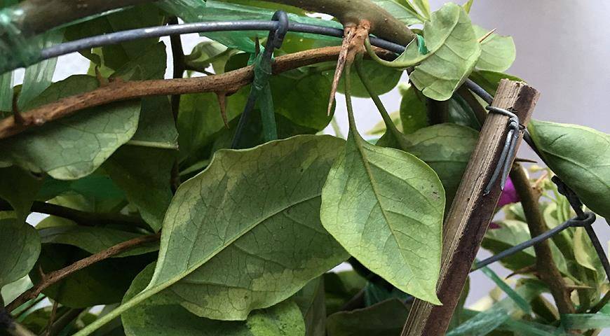 Бугенвиллеи очень резко реагируют на неправильный уход или условия, сбрасывая листья и цветки даже без очевидных серьезных промахов. Иногда для опадения бутонов достаточно даже несильного пересыхания почвы, не говоря уже о длительной засухе, оставляющей растение «голым».