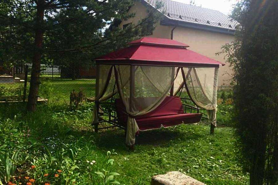 Простое обслуживание. Чистка навеса не составит большого труда и не займет много времени, так как любое поверхностное загрязнение тента-крыши для садовых качелей легко смывается водой из поливочного шланга.
