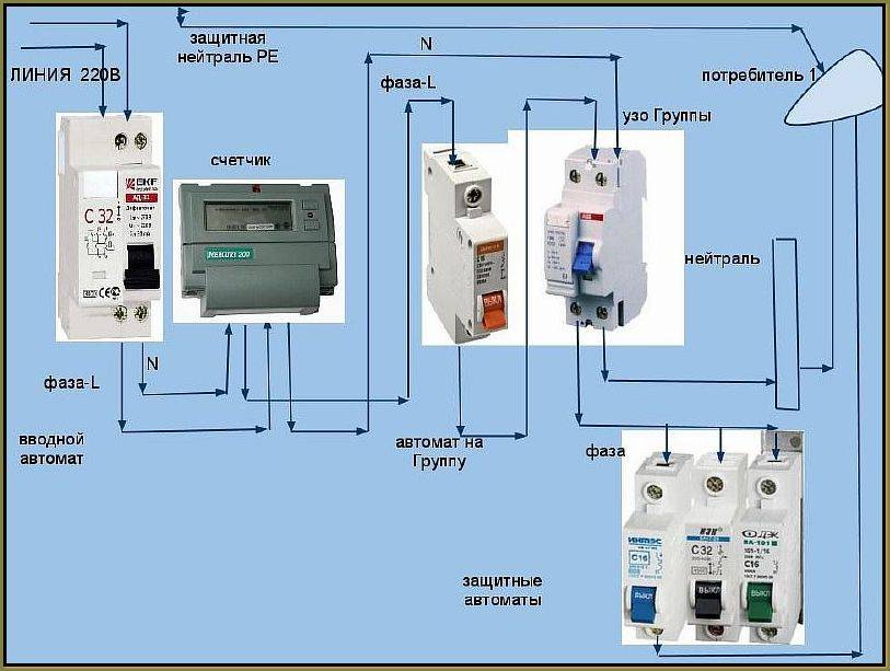 Для уменьшения количества изделий возможно разбивка потребителей на группы. Например: группа освещения; группа электробытовых стационарных приборов (холодильник, варочная панель); группы особо опасных помещений (ванная, кухня). Причем возможно применение одного УЗО на группу автоматов, защищающих от перегрузок определенных потребителей. После счетчика обязательно устанавливается вводное УЗО.