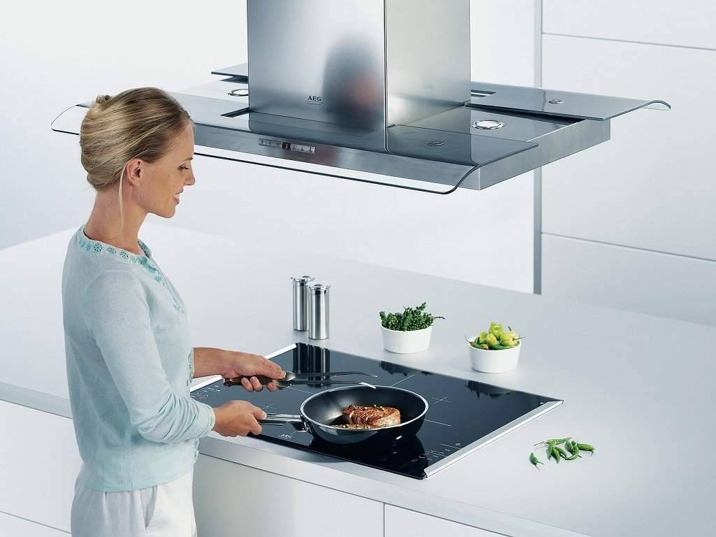 островные, размещенные над плитой, стоящей в центре кухни, отличающиеся обычно более высокой мощностью, интересным дизайном и стоимостью;
