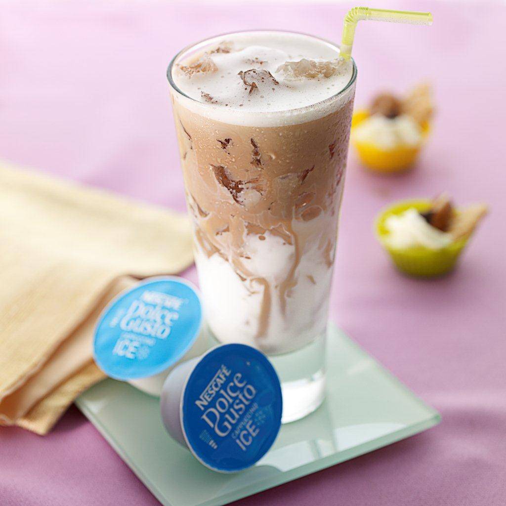 В состав летнего десерта на основе капучино входят охлажденный эспрессо (30 мл), молоко (60 мл) и шоколадный сироп.