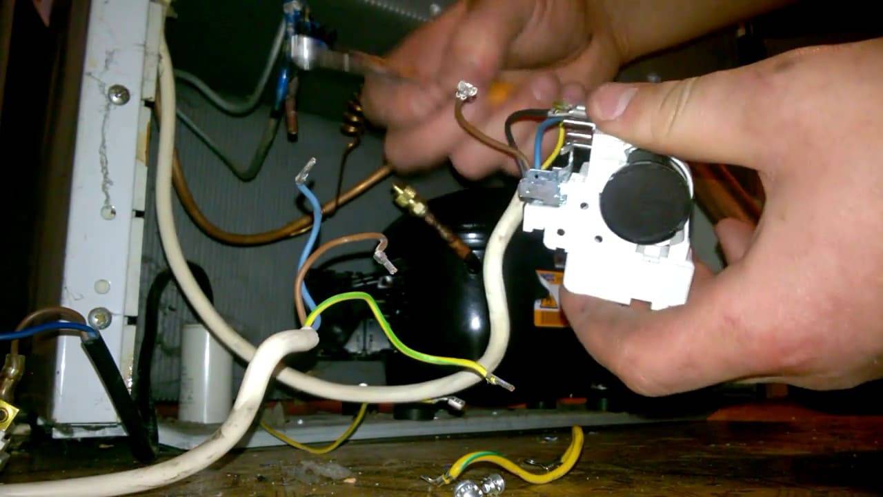 - Чтобы открыть доступ к нужным контактам, необходимо отсоединить при помощи отвертки подключенное к компрессору пусковое реле (три штырька, похожие на те, что торчат из обычной электрической вилки, и есть то, что нужно).