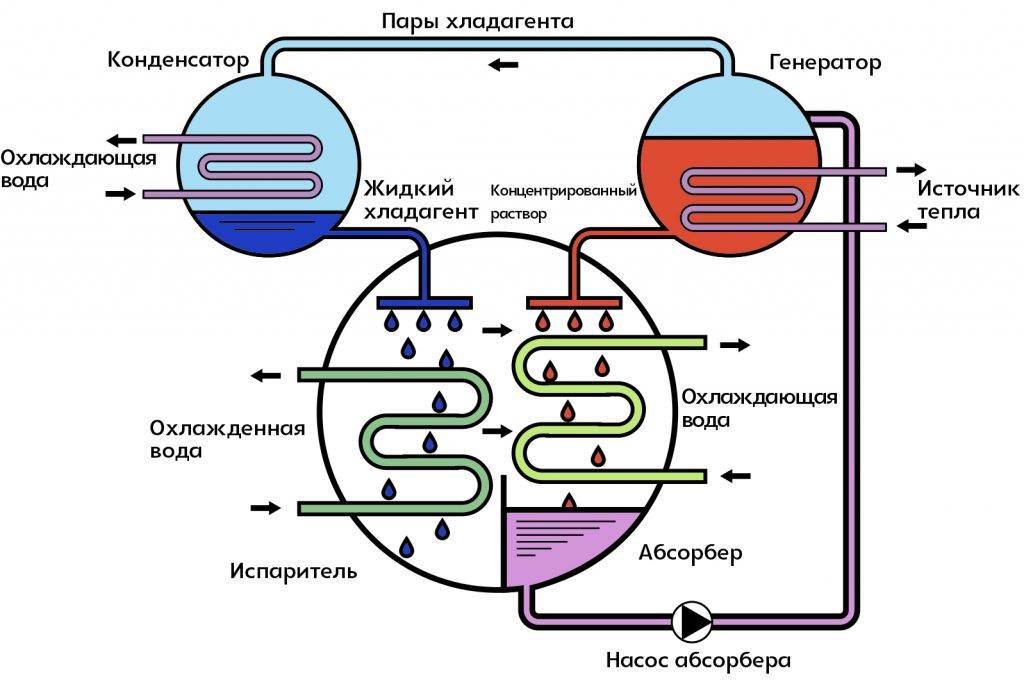 Подобные аппараты укомплектованы абсорбером, десорбером и дефлегматором. При растворении аммиака в воде вся смесь приходит в движение. Раствор, находящийся в абсорбере, за счет своих физических свойств, продвигается в десорбер, где снова разлагается на две предварительные составляющие. В конденсаторе рабочая смесь снова приходит в жидкое состояние, а затем опять отправляется в испаритель. Движение аммиака обеспечивается посредством струйных насосов.