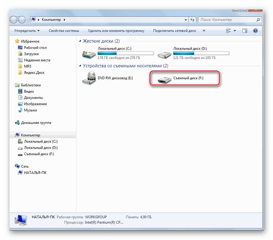 В окне с отображенными накопителями обратите внимание на блок «Устройство со съемными носителями» — именно в нем и расположена ваша флешка, обозначенная соответствующей иконкой. Дважды щелкните по ней, чтобы открыть носитель для просмотра