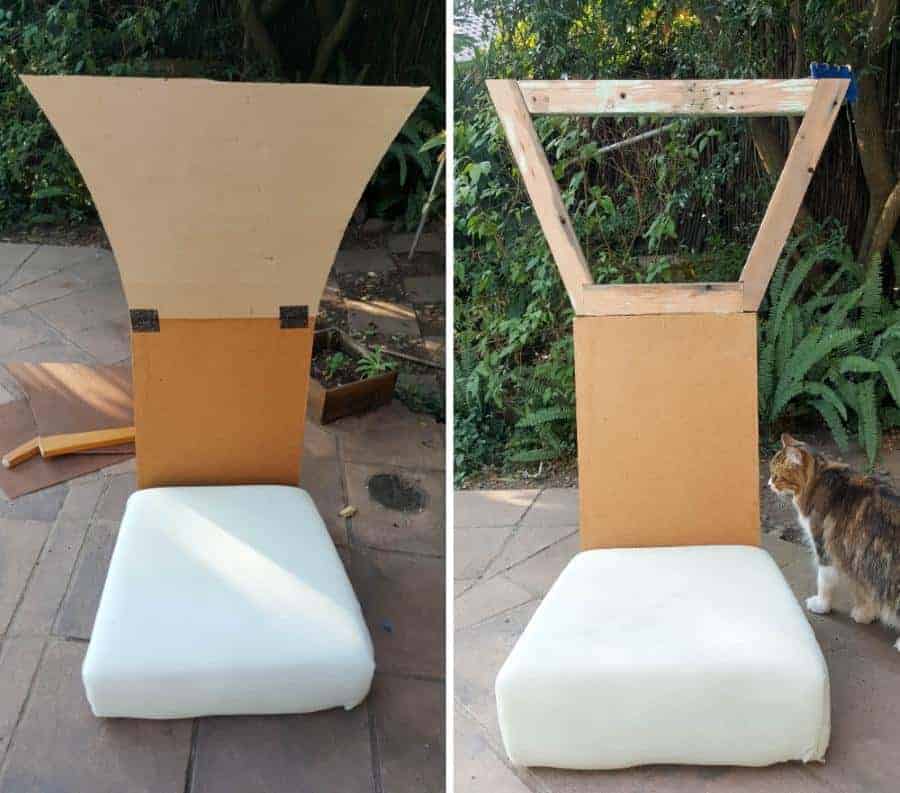 Итак, для начала нужно вырезать небольшой прямоугольник из наполнителя. Это может быть стандартный поролон или же синтепон. Отрезок фиксируют на спинке изделия, что обеспечит дополнительный комфорт во время сидения.