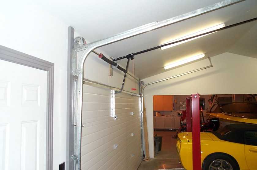 Остается установить стационарную раму в дверной проем гаража и закрепить ее с помощью анкерных болтов к боковым стенам гаража. Впоследствии места креплений потребуется тщательно залить бетонным раствором и заштукатурить.До того момента, как стационарная рама будет окончательно закреплена, потребуется выровнять ее положение по строительному уровню. Далее необходимо сделать П-образное приспособление, с помощью которого концы уголковых направляющих фиксируются к потолку.