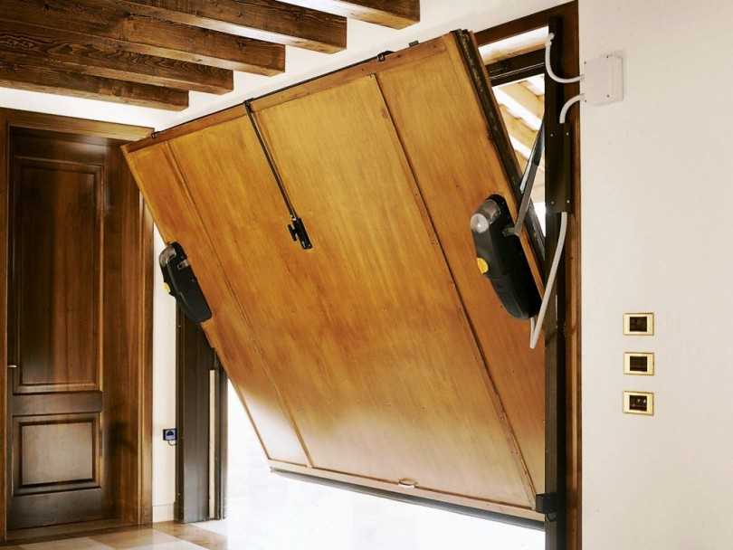 При открытии створка поднимается практически под прямым углом, после чего сдвигается на потолок.