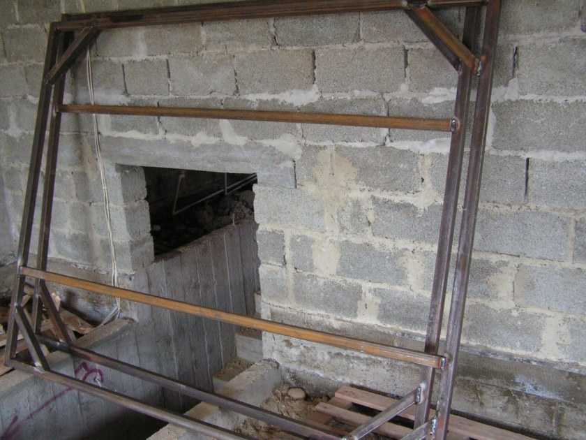 Проще всего изготовить конструкцию откидных ворот из стального уголка и швеллера. Первоначально потребуется измерить габариты дверного проема, вырезать из швеллера и сварить раму дверного проема гаража.
