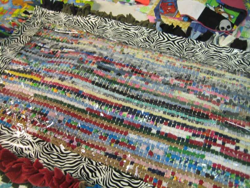 Технология создания напольного украшения достаточно проста и не требует много времени. Полоски ткани закрепляются на гвозди вверху и снизу, создавая тряпичное полотно. Чем ближе будут расположены гвозди, тем прочнее станет окончательное творение.