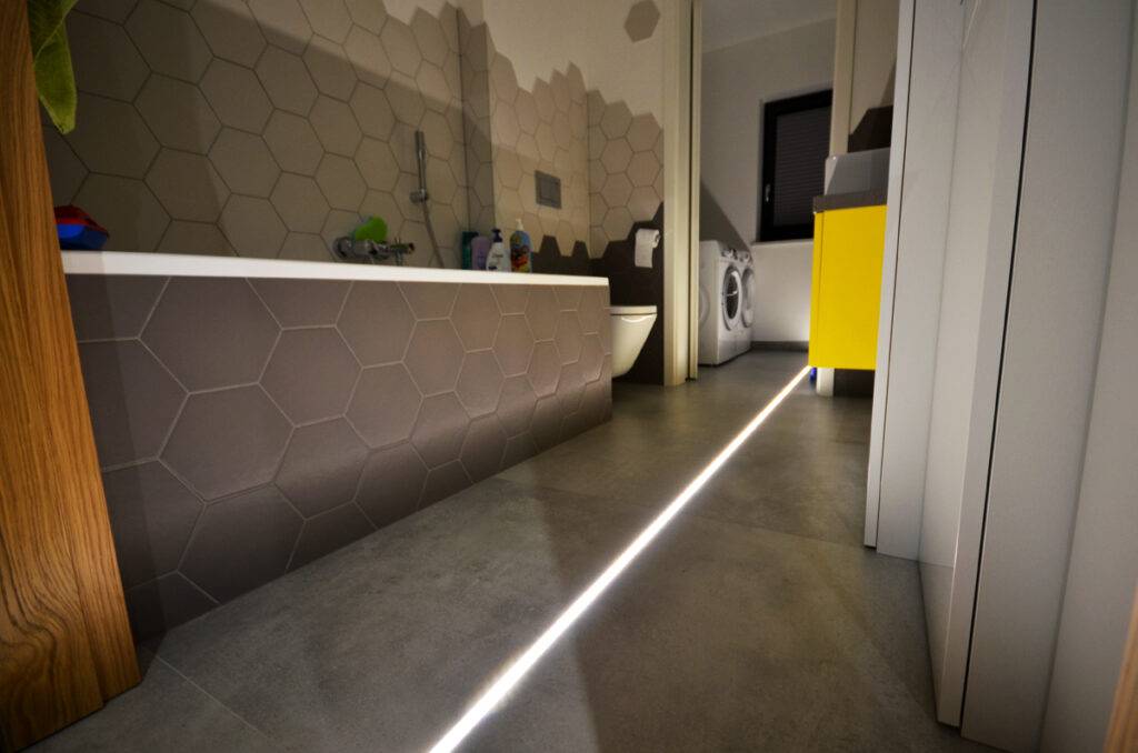 - водонепроницаемый светодиодный профиль, адаптированный для установки в стыках. Его следует дополнительно снабдить крышкой, желательно молочно-белого цвета, которая будет мягко рассеивать свет. Благодаря ему вы получите желаемый эффект световых полос.