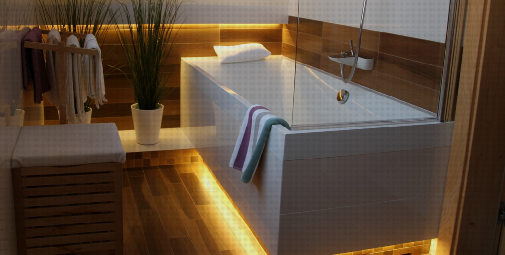 - водонепроницаемые светодиодные ленты. На рынке представлены различные цвета этого типа освещения. Если вам нужен сдержанный эффект, лучшим светом будет белый слегка желтоватый оттенок (он будет соответствовать теплым тонам интерьера) или слегка голубой (он будет хорошо сочетаться с холодными цветами). Если вы хотите получить более театральный эффект, мы можем поэкспериментировать с цветными светодиодами.