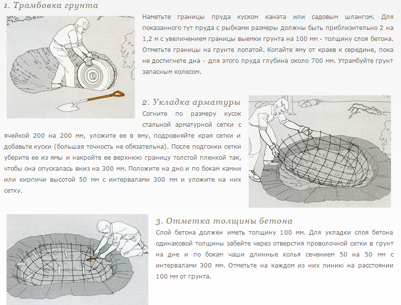 Выкапывают яму, делают подушку из камня и песка, опалубку из бруса, заливают первый слой бетонной смеси. Во влажный бетон вдавливают армирующую сетку, штукатурят все плоскости, дают просохнуть. После просушки покрывают пруд акриловой краской. Финишную отделку проводят после тестирования водоема – если после заполнения водой нет протечек, зону облагораживают, в воду пускают рыбок, высаживают растения.