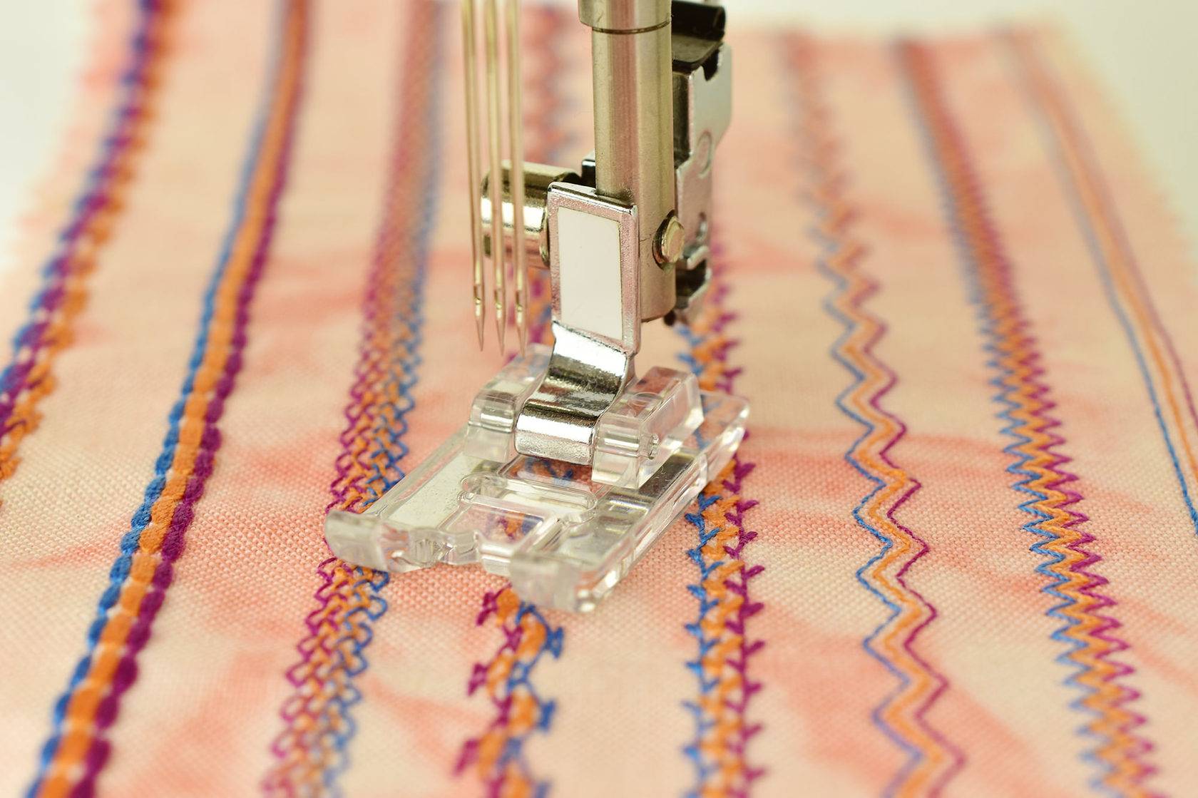 В свою очередь, тандем двойной иглы со специальной лапкой позволит ещё больше расширить возможности при работе, обогатив её дополнительными операциями. С их помощью можно пришивать тонкие бусинки, шнуры, формировать защипы и прочее.
