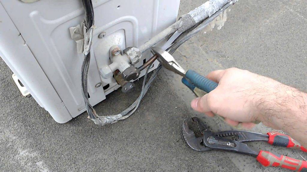 Работы начинаются со снятия внешнего блока. Для этого сначала необходимо отсоединить медные трубки. Трубки обрезаются на расстоянии порядка двадцати сантиметров от штуцера, а после зачеканить срезы для полной герметизации.