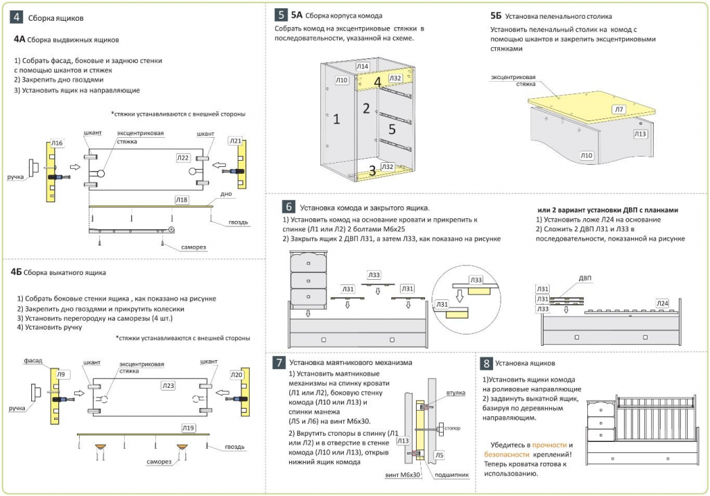 В комплектацию модели входят каркас, ложе, ножки, спинки, маятниковый механизм. Многие изделия дополняются ящиками, пеленаторами, комодами для хранения вещей. В какой последовательности собирать детскую кровать с маятником по инструкции: