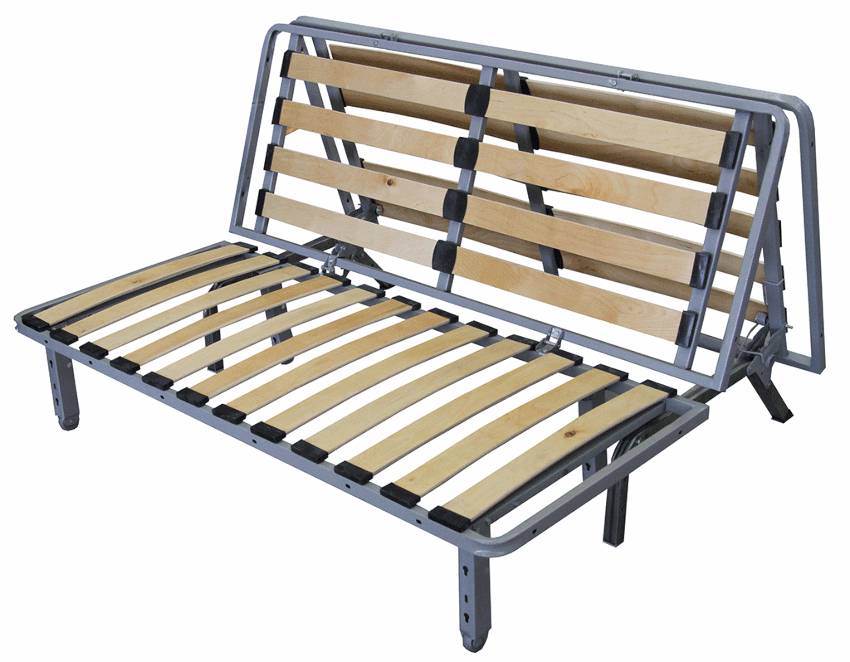 Каркас состоит из основания, спинки, подлокотников и ножек. Дополнительно устанавливаются механизмы и ящики. Основание представляет собой раму из бруса, укрепленную ламелями. Их нужно не менее 32 штук. Ножки рекомендуется делать высотой до 10 см. Обязательно используйте прочные породы дерева. Прочности можно добавить металлическими уголками.