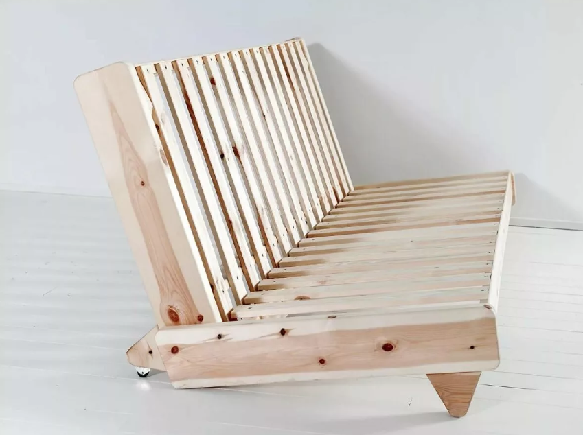 Каркас состоит из основания, спинки, подлокотников и ножек. Дополнительно устанавливаются механизмы и ящики. Основание представляет собой раму из бруса, укрепленную ламелями. Их нужно не менее 32 штук. Ножки рекомендуется делать высотой до 10 см. Обязательно используйте прочные породы дерева. Прочности можно добавить металлическими уголками.