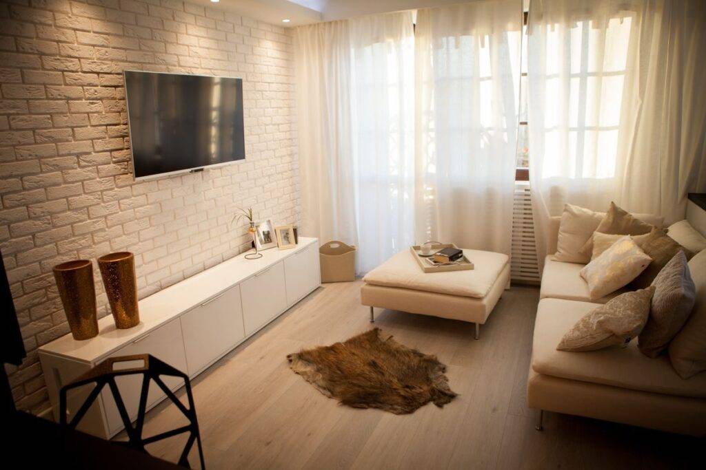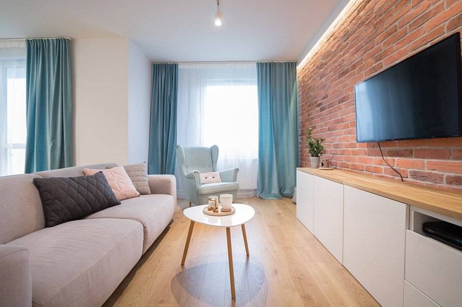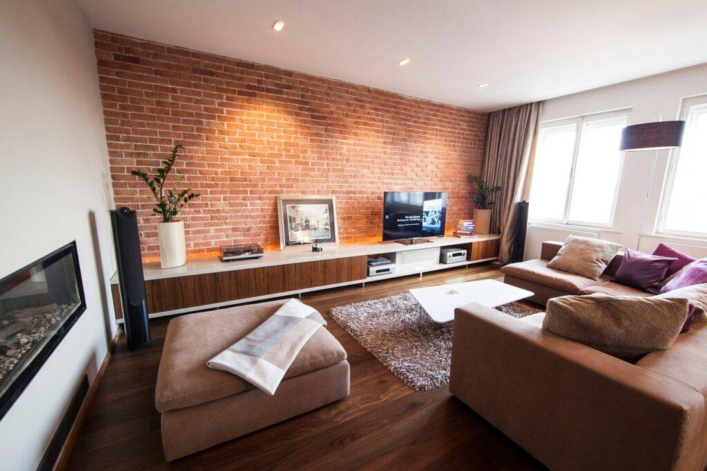 Кирпич в гостиной — минималистичный дизайн с контрастом