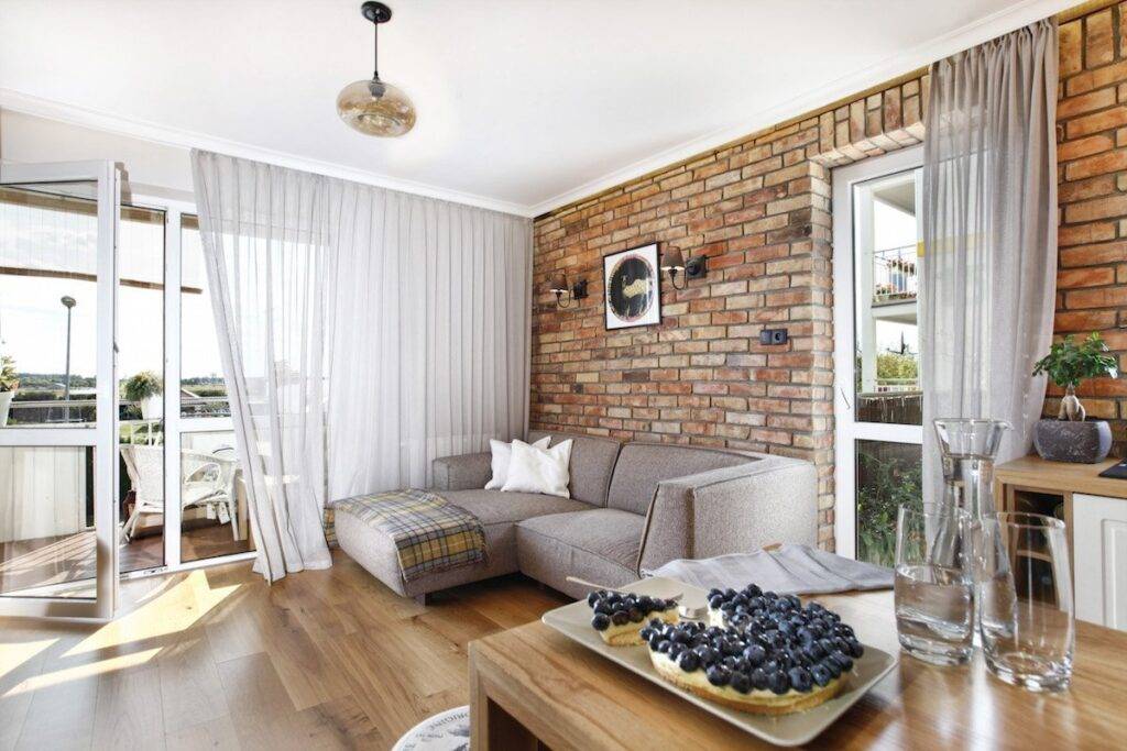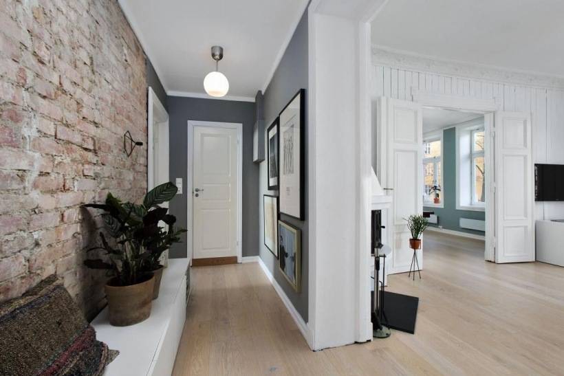 Красный кирпич идеально сочетается с белым цветом, поэтому, когда прихожая переходит в белую гостиную, вы можете с успехом использовать этот материал в смежной комнате. Благодаря этому вы получите интересное различие между этими двумя интерьерами. Тем более уместно будет использовать в гостиной кирпич или другие натуральные материалы, такие как дерево или бетон. Тогда в вашей квартире сохранится единый дизайн интерьера.