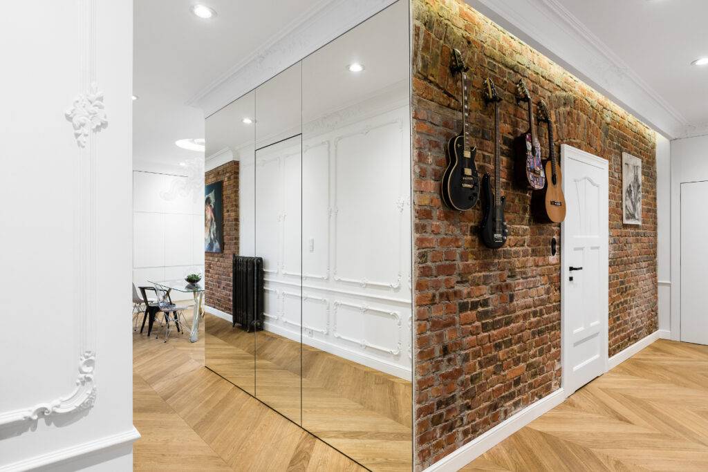 В коридоре белый кирпич в основном применяется с целью выделения стены со входной дверью, можно также создать акцент в зоне, где размещены подставки, зеркала, табуретки и другие элементы обстановки.