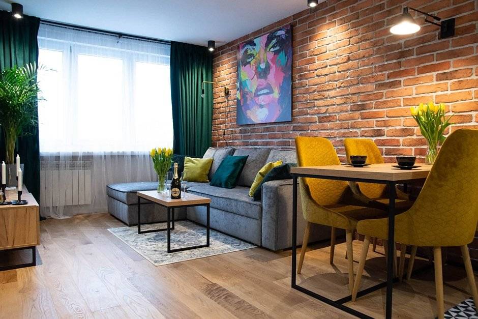 Сочетание кирпича с нейтральными цветами — это не только способ создать интересный и уютный интерьер, но и подходящий фон для мебели более ярких тонов. Диван или стулья в ярких тонах оживят интерьер и внесут в него немного свежести.