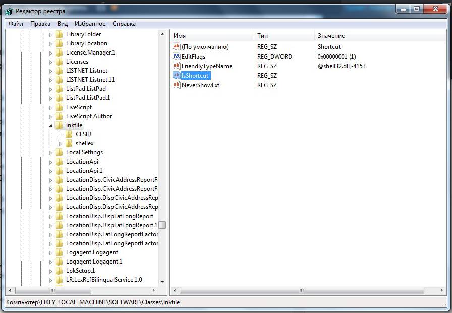 Первоначально этот самый редактор нужно вызвать. Откройте «Пуск», введите в нижнюю пустую строку «regedit.exe». Когда откроется реестровое окно, внимательно пересмотрите все ветки, после чего найдите нужную нам: «HKEY LOCAL MACHINE \ SOFTWARE \ Classes \ lnkfile».
