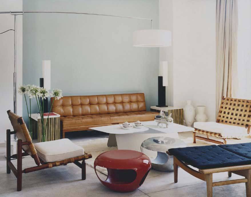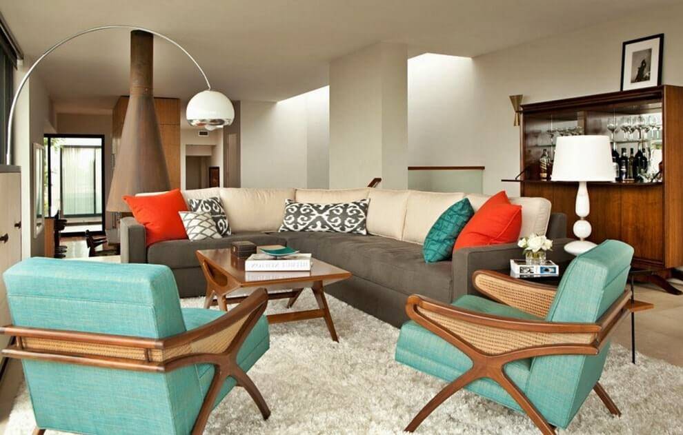 Диваны широкие и удлиненные с разноцветными подушками для используются для дополнительного оттенка цвета. Шестидесятые годы были временем прогресса, позволившего использовать необычные материалы для производства мебели. Например, пластик может быть использован для стульев, столов, абажуров и других.
