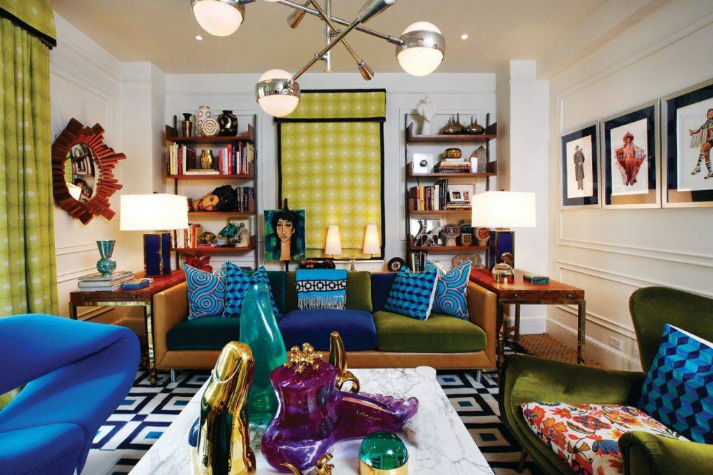 - Яркие цвета. Палитра зависит от периода, под который стилизуется пространство, но в основном используются насыщенные (голубой, оранжевый, желтый, красный) или плотные, глубокие (бордо, индиго) оттенки.