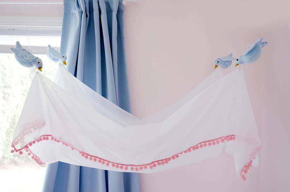 Девочки — это принцессы. Ещё с самого раннего возраста им нравится чувствовать это. Постарайтесь навесом подчеркнуть, что ваша девочка — принцесса, которая живёт в замке (только без фанатизма). Используйте однотонные, светлые тона ткани, с применением бантов, что сможет подчеркнуть нежность и женственность вашей маленькой дочурки.