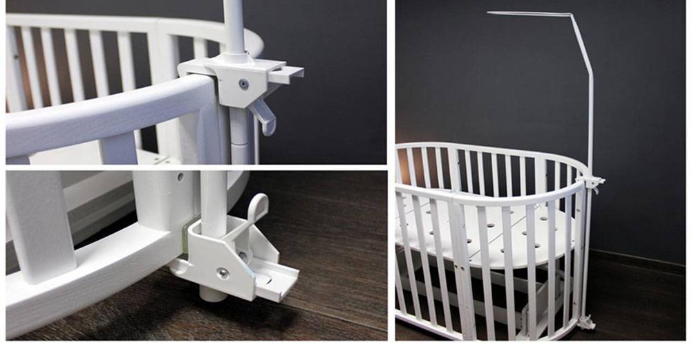 - Стойку прикрепить сверху к перекладине самой кроватки с помощью винтов.