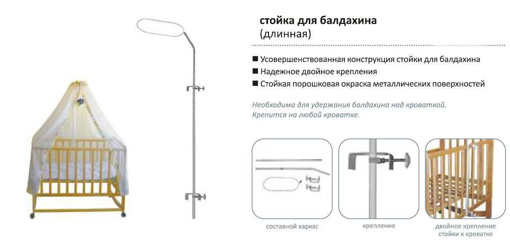 - С помощью палки для балдахина или кронштейна-держателя. Такое устройство устанавливается на пол или крепится к кровати, но сначала нужно выполнить его сборку. Высота держателя регулируется. Подходит для всех типов кроваток.