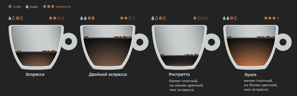 - ристретто. Отличается насыщенностью. Воды используется меньше;