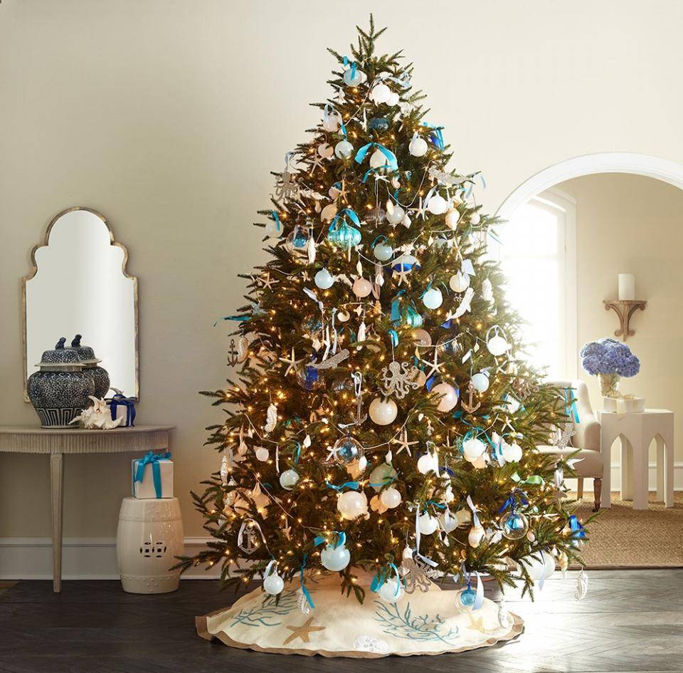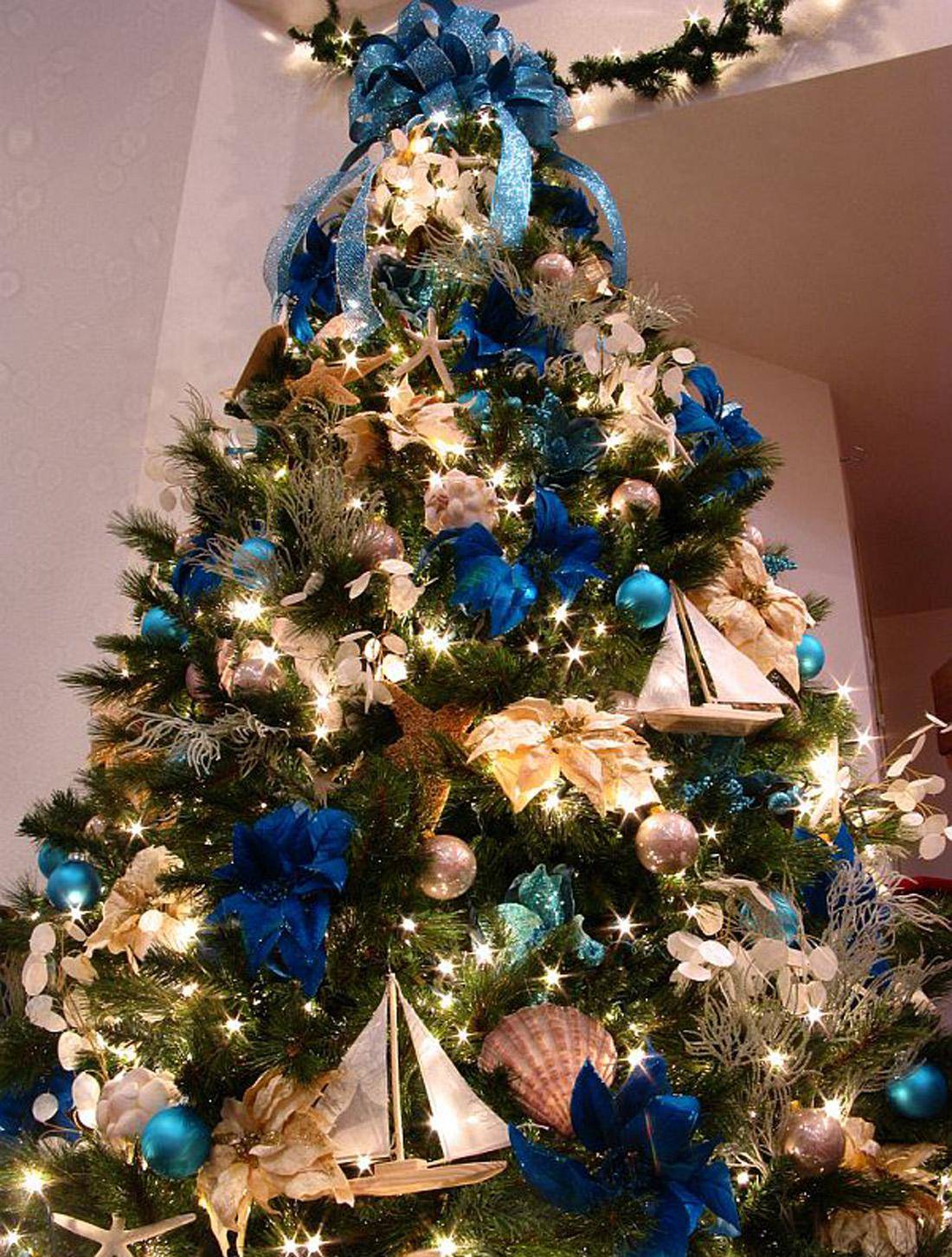 Синие элементы в декоре елки на Новый год в морском стиле