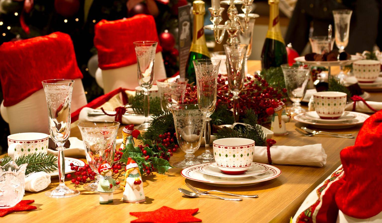 Украшение новогоднего стола в красно-зеленых тонах