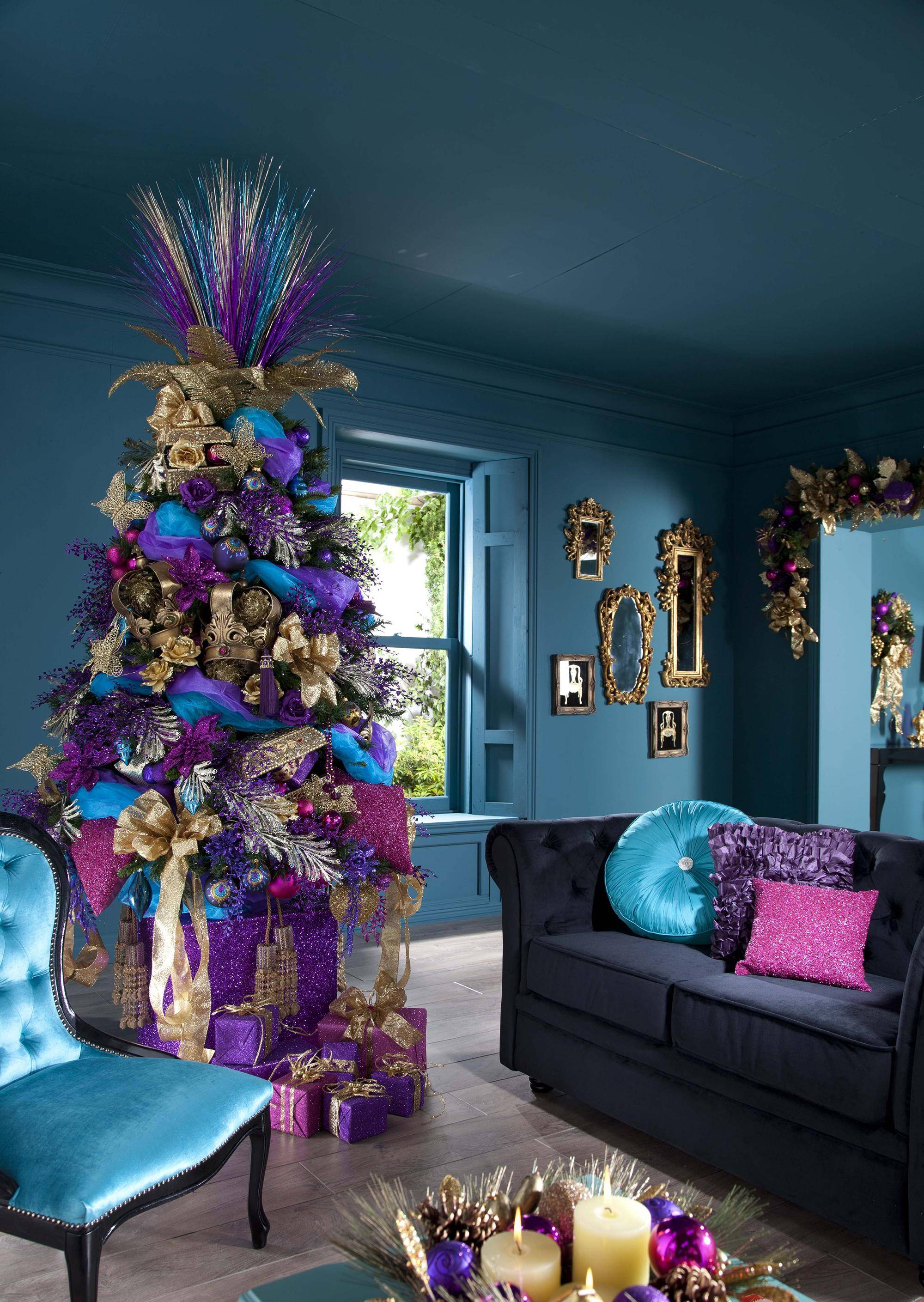 Фиолетово-золотистый декор елки на Новый год