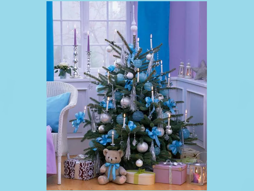 Стиль направлен на подчёркивание красоты самой новогодней красавицы. Цветовая гамма здесь создаётся из двух-трёх оттенков синего. Придётся обойтись без излишнего блеска. Хотя этому стилю и много лет, он совсем не стареет. Однако каждый год требует нового колорита. В этот раз можно внести: