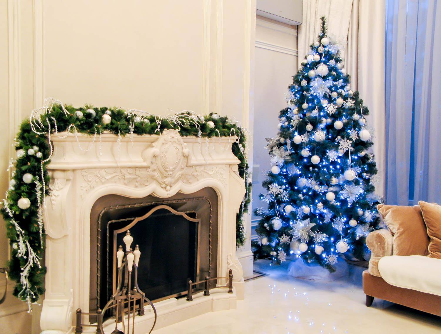 Бело-синий декор елки в квартире