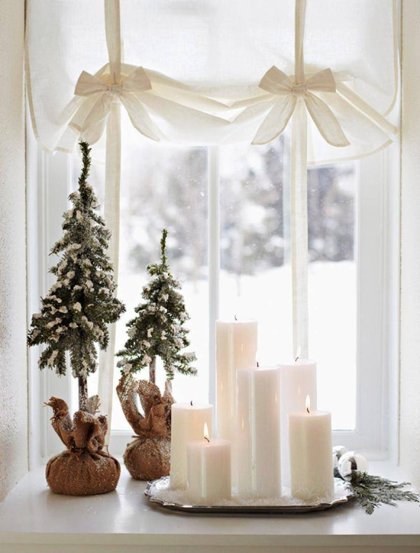 Новогодние свечи и елочки на окне