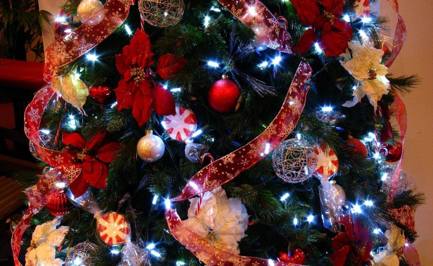 - Когда в доме нет подходящих игрушек, то украшения можно сделать своими руками. Для этого понадобятся самые обычные шелковые ленты. О сочетании цветов мы уже упоминали выше, поэтому выбирайте ленты именно этих оттенков. Ленты могут быть широкими или узкими.