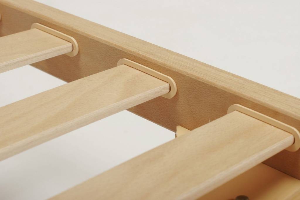 Ламели могут крепиться к каркасу кровати специальными держателями, изготовленными из пластика, каучука или полипропилена. В свою очередь, держатели крепятся к каркасу заклепками или мебельными скобами.